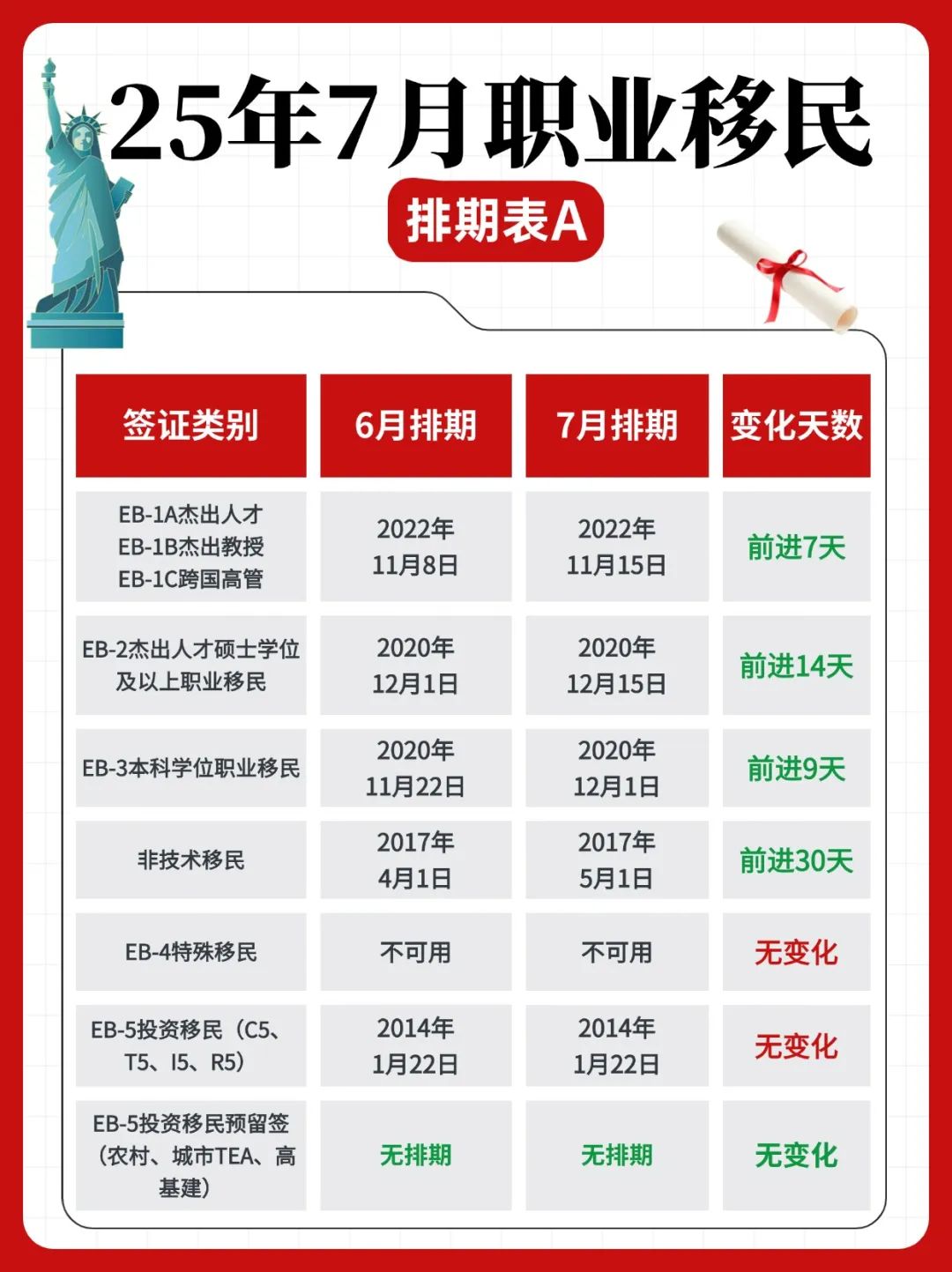 好消息!美国国务院于6月10日公布了2025年7月份的各类移民排期表。不负众望,EB-1时隔8个月的停滞,在7月份终于动了!