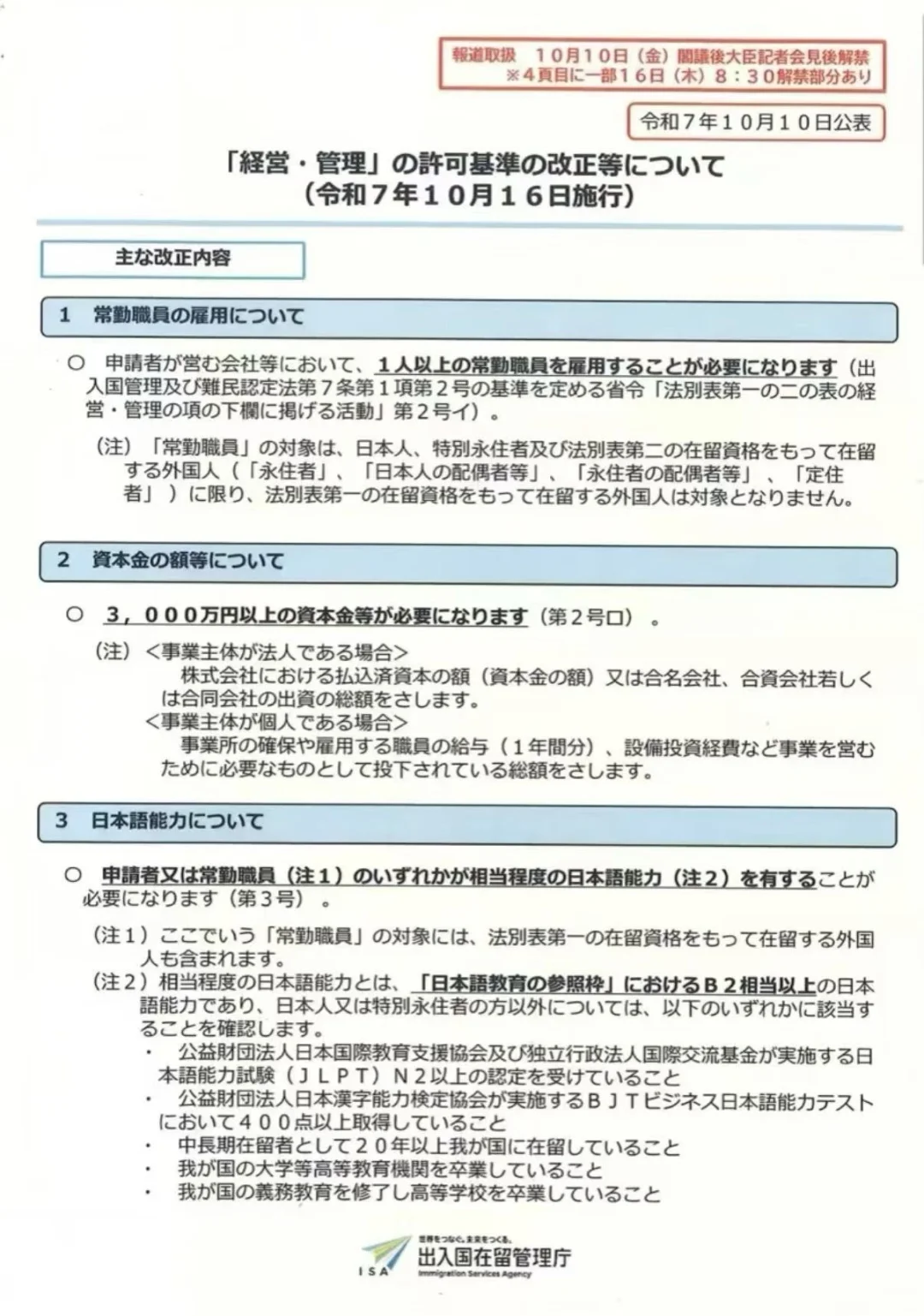 日本出入国在留管理厅10月10日正式公布,2025年10月16日起实施修订后的《经营管理签证》制度,这是自2006年以来对该签证要求最严格的一次制度升级。旨在强化日本外国人企业经营的真实性和能力的要求,全面提高签证申请门槛及续签门槛。
